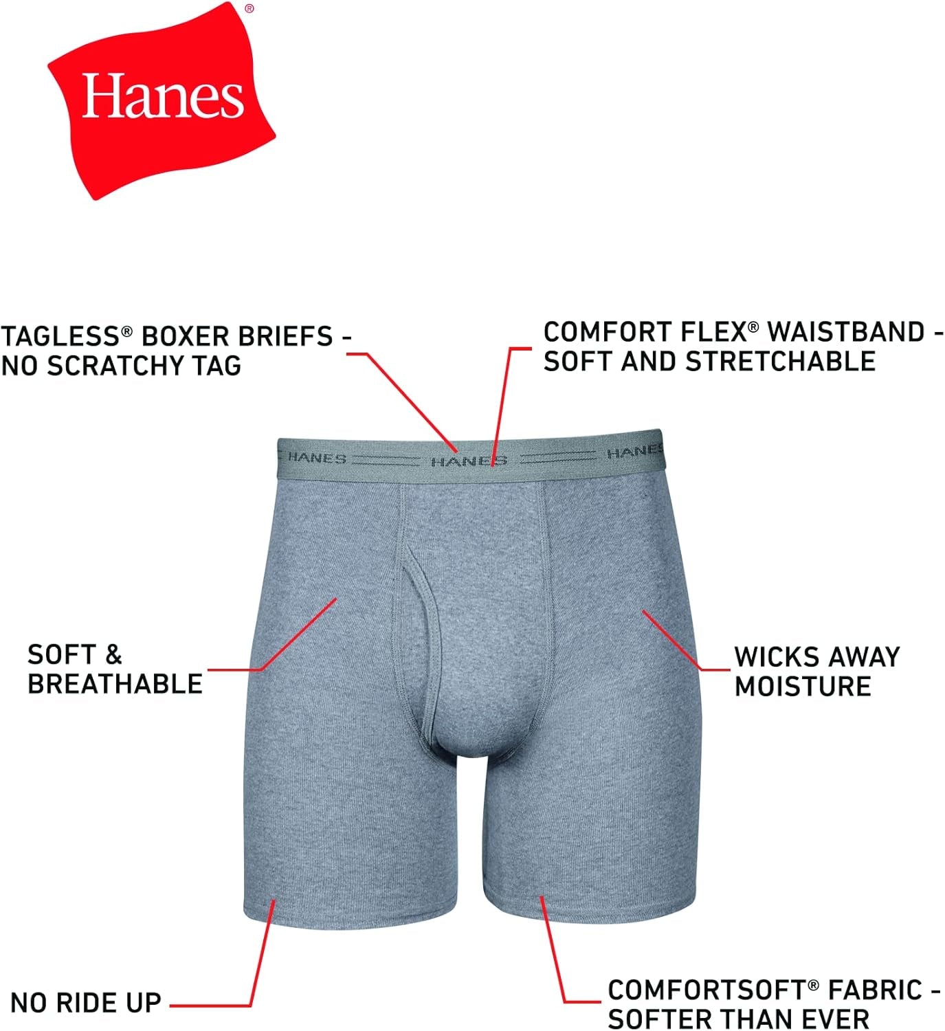 This Hanes® value pack includes twelve pairs of men's boxer briefs crafted from soft and breathable cotton for everyday comfort (heathered boxer briefs are a cotton-rich blend). You'll appreciate the no-ride-up fit, smooth Tagless® interior, and an improved Comfort Flex® waistband that adjusts to fit you. Moisture-wicking Cool Comfort® fabric helps keep you cool and comfortable - no matter how long your day is. Stock up and save with this multi-pack of men's boxer briefs in assorted solid colors so you can always keep a clean pair of Hanes underwear on hand.