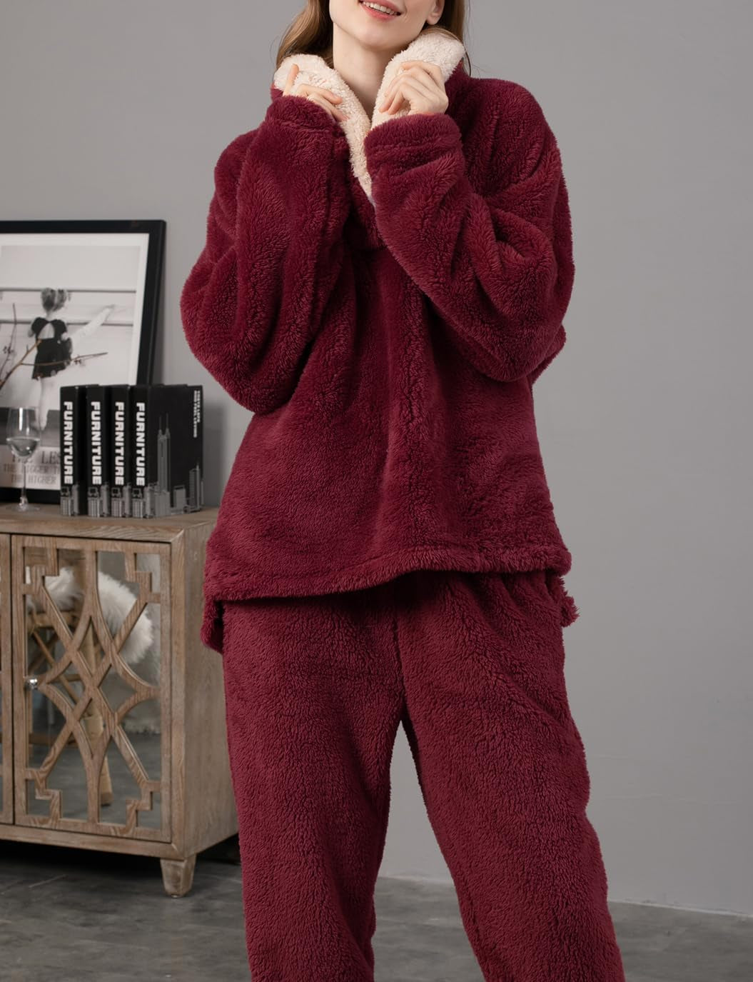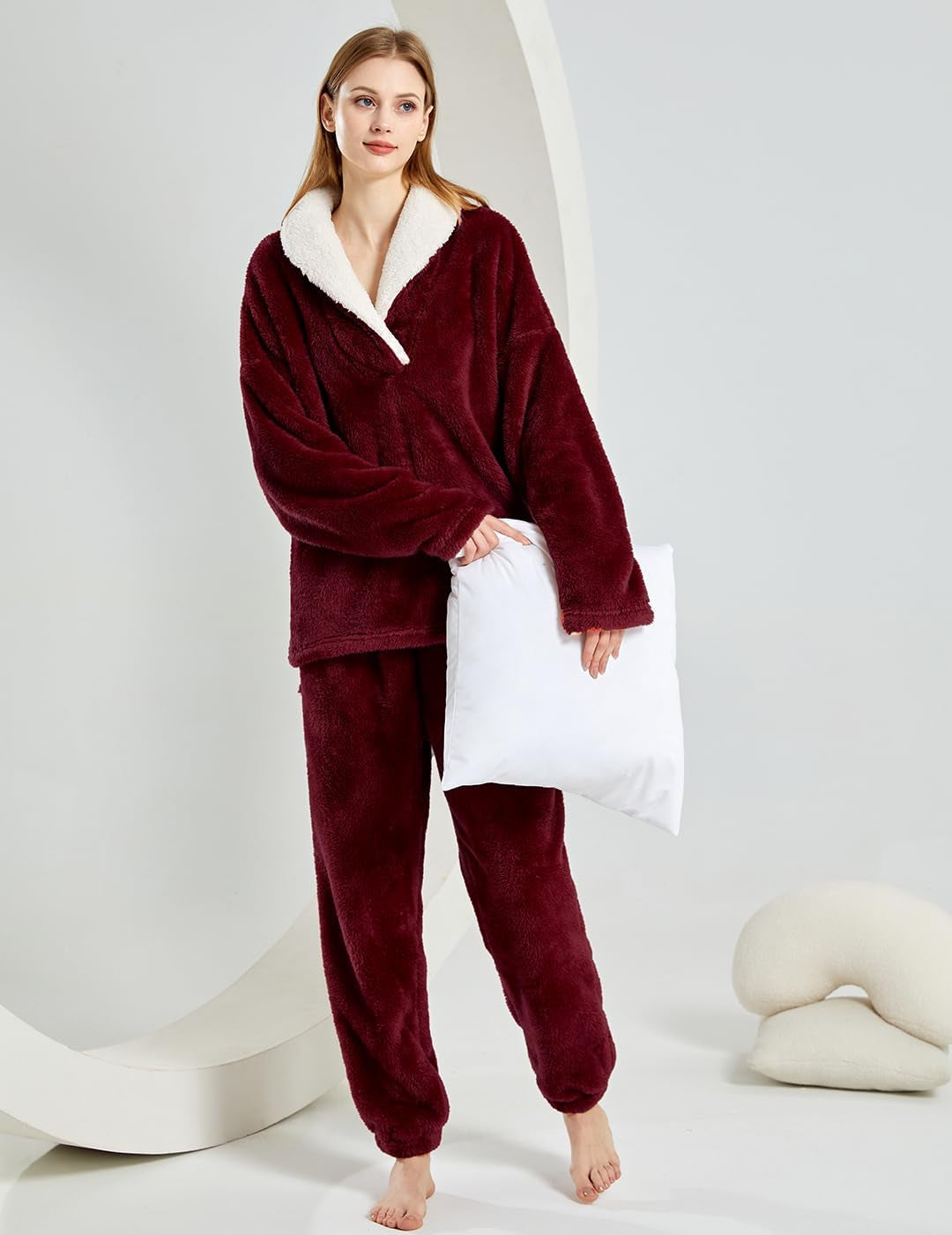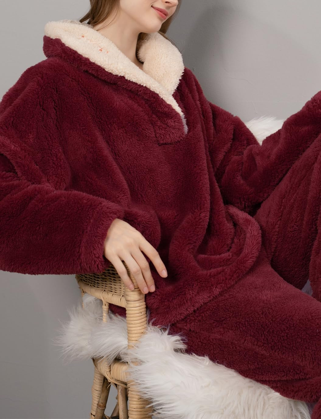 Long Sleeve Pullover Tops Sherpa Fleece Sweater Pajamas Set
