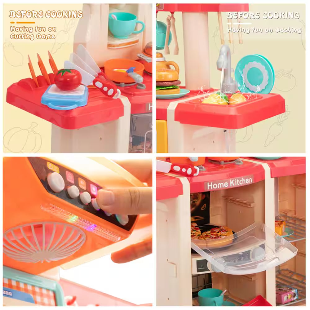 Are you seeking for a Christmas gift for your little one. This Kids Kitchen Playset is your best choice.The 65-pieces of kitchen playset give your kids infinite entertainment. Your kids can wash vegetables in our play sink with running water, cook delicious meals on the stove with simulated sounds, fire and even steams and don't forget to turn on our ventilator when cooking. The whole family can share the happiness with our baby (Over 3) that cultivate his hands-on ability and creativity. After finishing cooking, remind your little to keep all utensils organized and place them into oven, fridge or shelves on the top. What's more, our play kitchen set are made of eco-friendly material that is certainly safe for our kids. Take it home and become a little chef now!